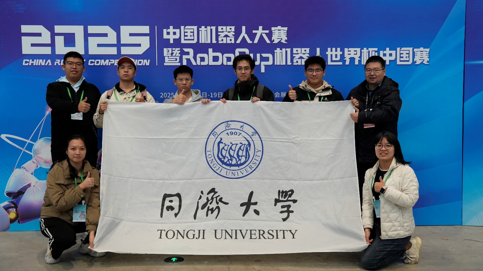 另一支主力——同济大学人工智能+机器人竞赛TJSRCLAB实验室,派出的四支队伍同样以电信学院学生为骨干,汇聚了四个学院的优秀学子。团队在我系张志明、工程实践中心杨晓圆及我系朱劲老师指导下,由张旭磊(自动化)辅助管理,在四个赛项中均取得突破:同舟•济世澄新队斩获智能清洁机器人挑战-餐厅3D清洁赛项全国一等奖,队长为佐健晔(自动化),队员包括张凇源(自动化)、周纯伊(中德工程学院/机械电子工程)、张方杰(控制科学与工程)、曹文旭(电子信息);智信•Hawkeye队伍获机器人先进视觉赛3D识别赛项全国二等奖,队长为陈婉琳(自动化),队员包括王潇扬(计算机科学与技术学院/计算机科学与技术)、王星达(微电子科学与工程)、汤睿晨(自动化)、张慧(微电子科学与工程);智信•侦防先锋队伍获公共安全侦查机器人赛项全国三等奖,队长为吴佳佳(通信工程),队员包括张亦弛(电气工程及其自动化)、霍睿(通信工程)、谢承兴(人工智能);同舟共济队获武术擂台赛仿人格斗赛项全国三等奖,队长为宗慕雪(电气工程及其自动化),队员包括陆欣蕊(电气工程及其自动化)、史艺雯(土木工程学院/智能建造)。